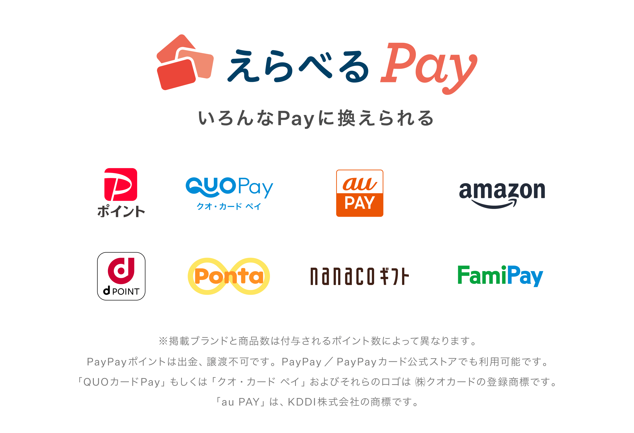 PayPayポイント / QUOカードPay / Pontaポイント / Vマネー / nanacoギフト / FamiPay / ギフティ プレモPlus / Visa eギフト /dポイント / au PAY ギフトカード / Gポイント / Vポイント / セブン銀行「ATM受取」 / EdyギフトID / WAON POINT eギフト / JAL Payポイント / Visaギフトカード(Ⅴプリカギフト)